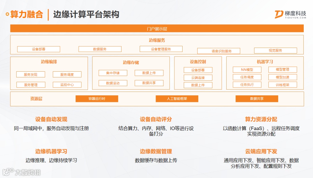 边缘计算中,需要将数据中心能力延伸到边缘侧实现算力融合。梅进表示,在规划边缘计算平台时,需要具备设备自动发现与注册、设备自动评分、算力资源分配、边缘机器学习、边缘数据管理以及云端应用下发等六大核心能力。