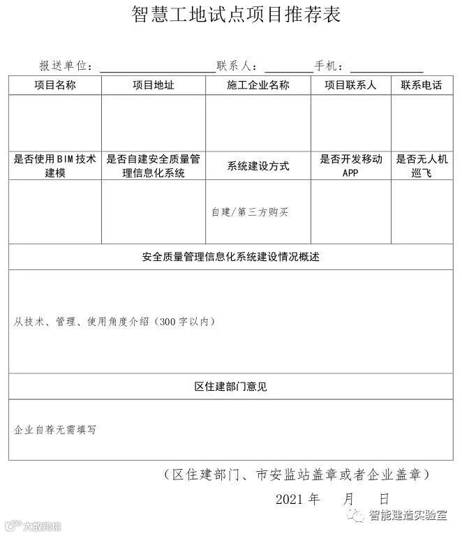 由市安监站牵头负责市管在建项目,各区住建部门牵头向区管在建项目参建企业广泛宣传,并组织开展所辖在建工程的智慧工地试点项目申报工作,通过各区住建部门、市安监站推荐以及项目企业自荐参加的方式,对照试点工作要求与相关标准,填写《智慧工地试点项目推荐表》