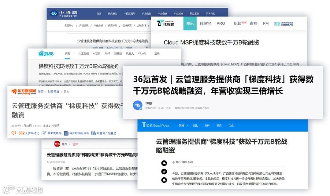 作为专注于云计算的高科技企业,梯度科技此轮融资,在行业备受关注,36氪、钛媒体、今日头条、搜狐网、东方财富网、中投网等数十家媒体竞相报道。
