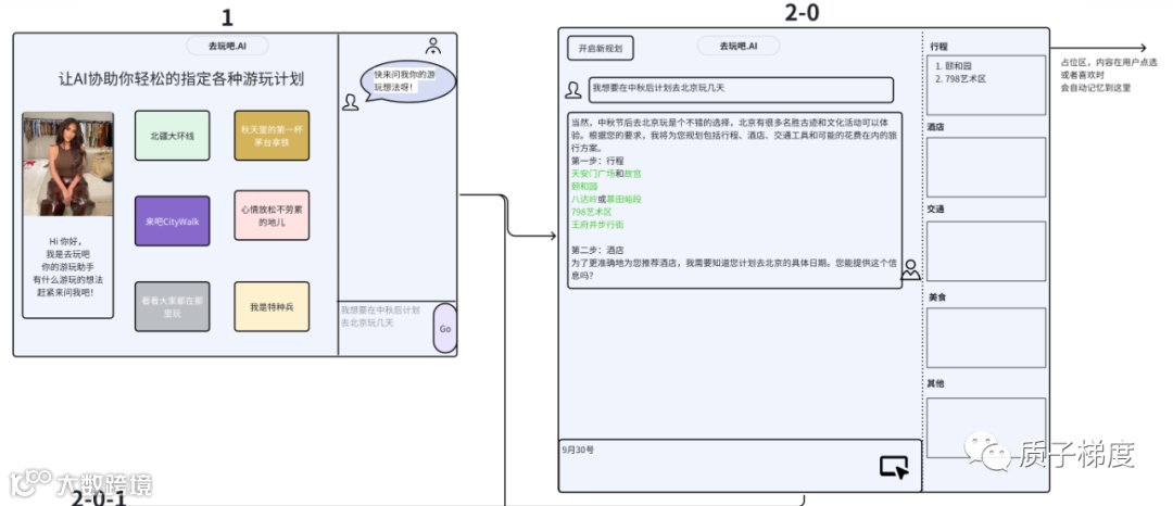 然后我们引导用户进入到了意图细化环节,也就是对话界面。并在对话的右测限制了对话的意图结果展示,以此来减少用户的意图迭代次数。同时我们也在对话中进行了操作绑定,比如行程中的景点名称,如果用户点击了喜欢,我们就会把ta放到了右侧意图展示中。当用户完成必要的对话之后,我们就会根据右侧的所有意图,让AI去生成符合意图要求的规划方案。