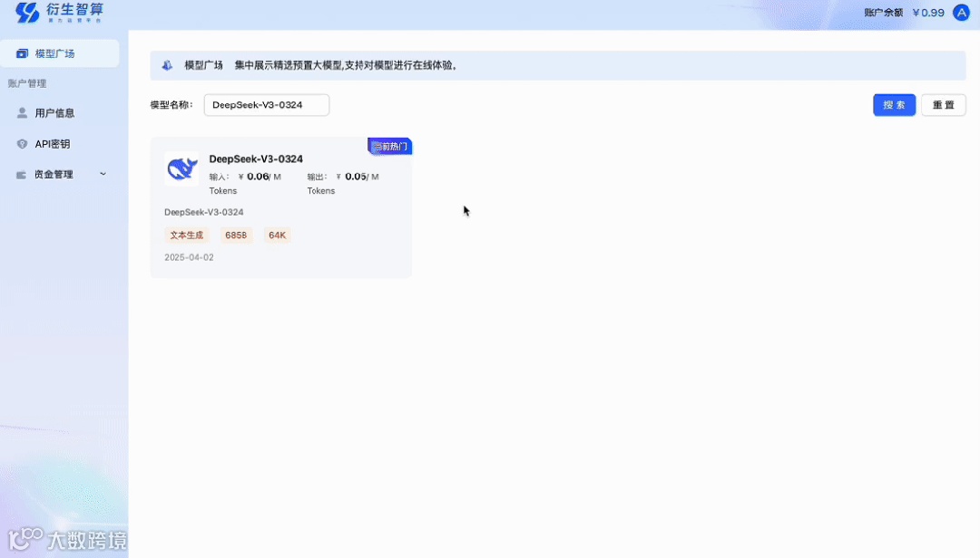 衍生智算系统MaaS版则解决了以上模型使用或部署中面临的难题,企业或个人可通过web端或移动端直接使用或调用最新模型服务,无需自行训练与部署,可流畅使用DeepSeek、通义千问、Llama等主流模型。衍生智算系统MaaS版即衍生智算算力运营平台共两个功能板块,分别是模型广场和账户管理。