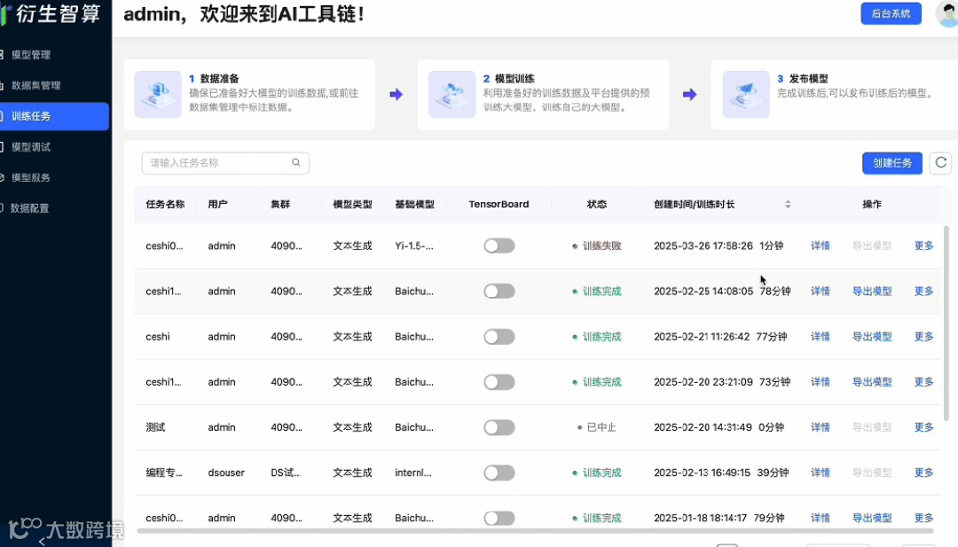 针对以上难点,衍生智算系统的AI一站式工具链平台给出了全套解决方案。AI一站式工具链平台共6个功能模块,包括模型管理、数据集管理、训练任务、模型调试、模型服务、数据配置,平台预置了市面主流开源大模型及众多开源数据集,可三步实现模型训练、四步实现模型推理,可电脑端实现一站式模型开发、部署与维护。