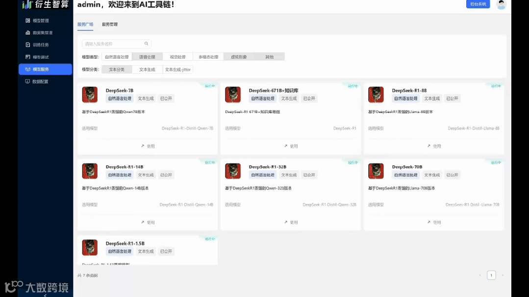AI一站式工具链平台预置了DeepSeek、通义千问、Llama等众多主流模型,及ms-bench、alpaca、gpt4all、cot、CodeAlpaca等开源数据集,用户可自行调用或展开模型训练。