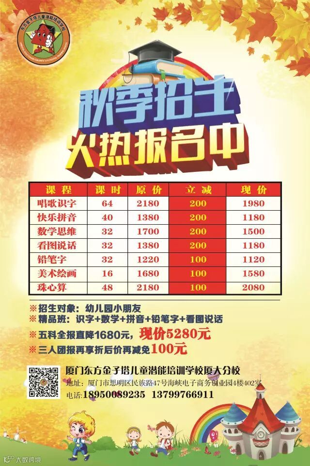 东方金子塔儿童潜能培训学校,2001年在北京创立,是一所集儿童潜能开发研究、培训于一体,具有国际教育特色的专业机构。主要科目有儿童珠心算、唱歌识字、快乐拼音、看图写话、幼儿衔接、数学思维等科目。