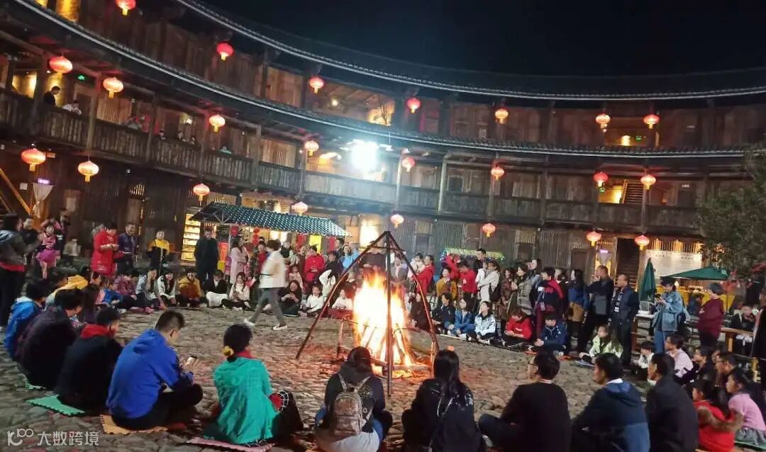 入夜的篝火熊熊,温暖了有一丝凉意的土楼,点亮了夜色的静谧,人们把酒言欢,露天KTV,载歌载舞,烟花夺目绽放,瞬间洗去疲惫回归自然。