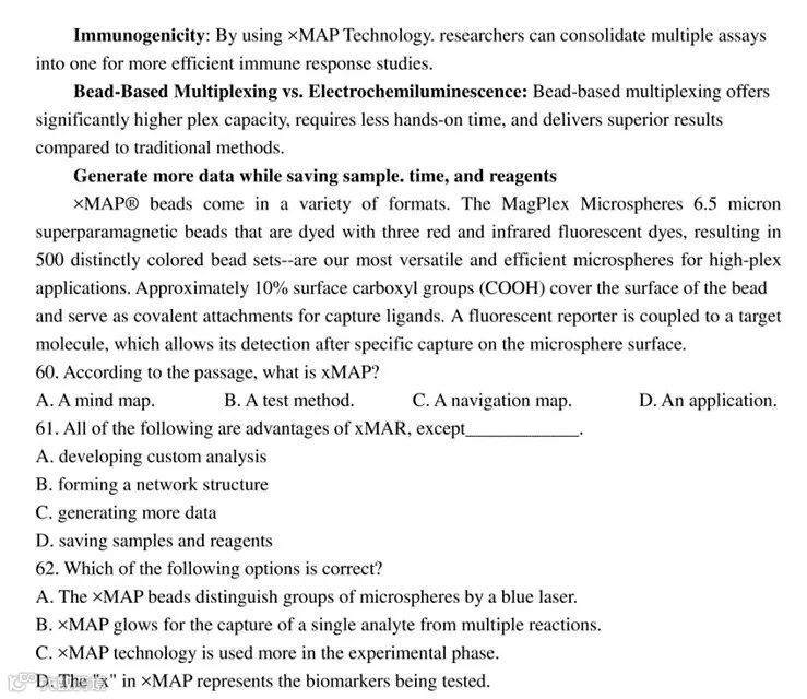 xMAP®多重检测技术采用了微球染色编码以及流式的进样原理配合其对应仪器实现了完美的多重检测效果。Luminex应用的荧光编码微球带有针对不同目标分子的特异性抗体,多种不同的编码微球在一定程度上可以自由组合,这样在一次实验中可以同时完成多个目标分子的分析。多目标分子的同时测定可以大大减少生物样品的消耗量,节省成本并缩短整个反应操作流程的时间,使多种目标分子之间相关性的分析更加准确。Luminex蛋白/核酸类靶标的多重检测用于基础和临床医学研究以及临床检测,目前已经可以检测超过2000种各类蛋白质分子,包括细胞因子、激素、自身抗体、肿瘤标志物、SNP多态性分析,多病原检测与分型等。