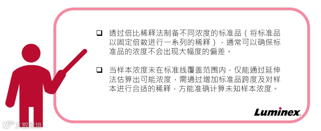 在 xMAP® 的平台上进行定量实验时,需要提前准备好不同浓度的标准品,再根据实验测定所获取的荧光数值,绘制出标准线。