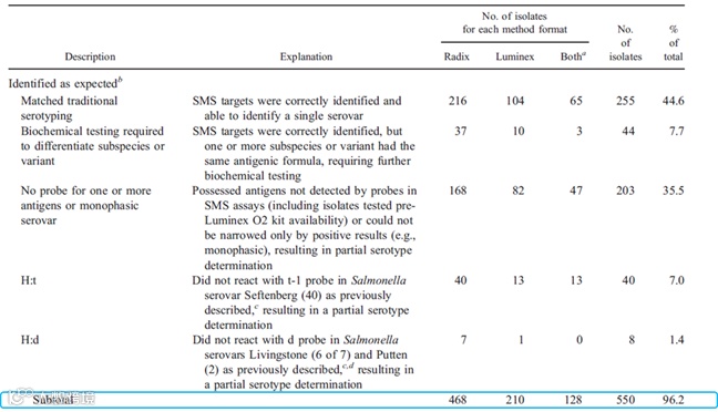 96.2% 的菌株(550 株)可被 xMAP® 沙门氏菌分子分型法正确识别。