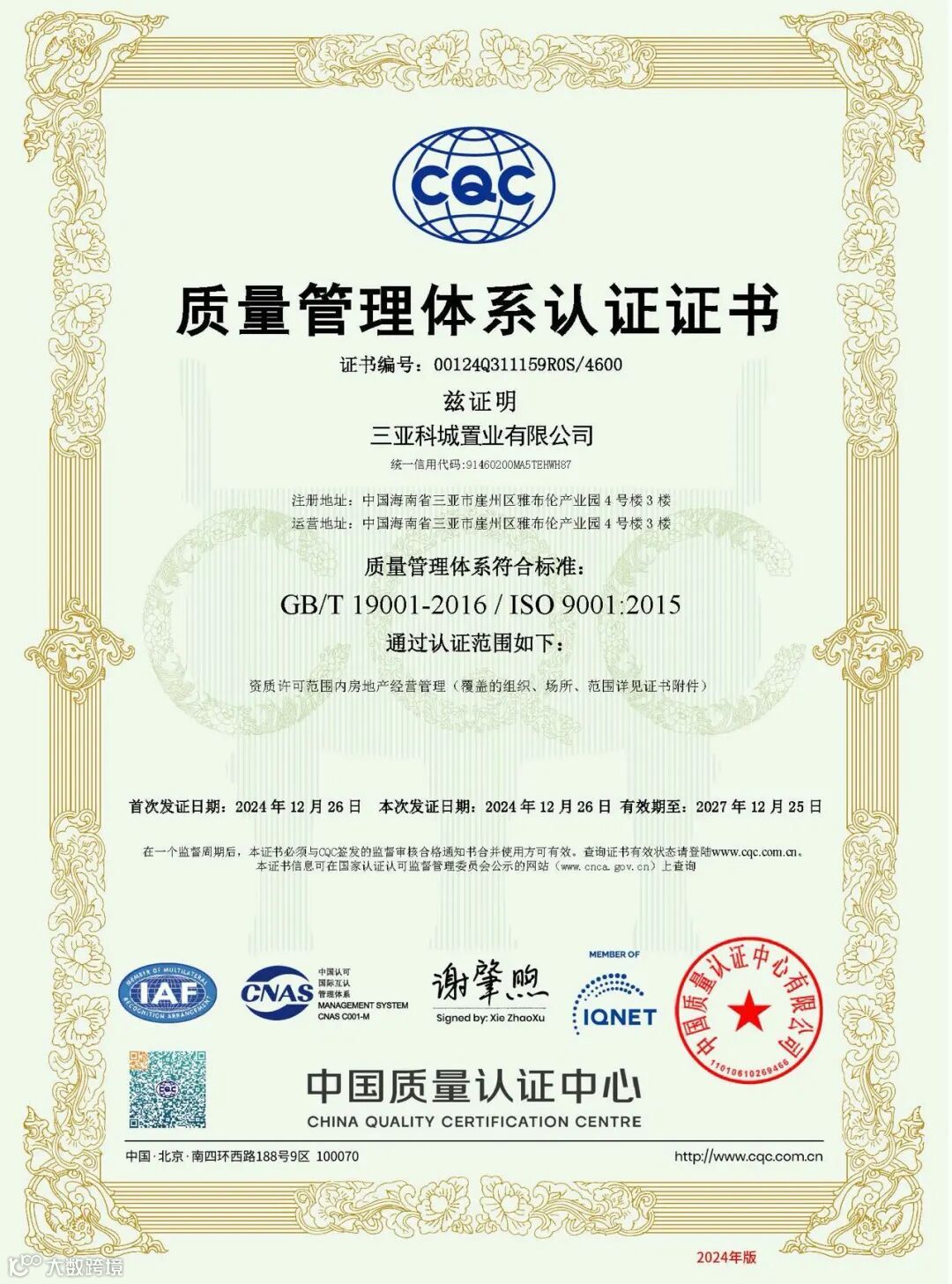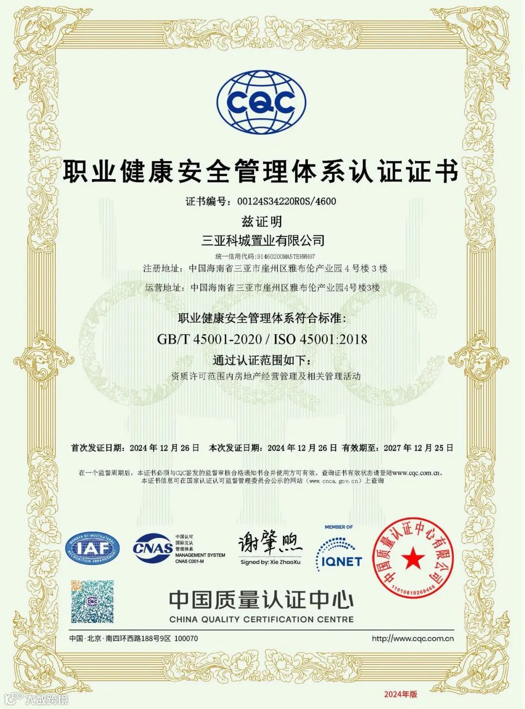 中国检验认证集团海南有限公司专家组通过查阅文件、现场检查、沟通询问、抽样验证等方式,对科城置业公司的质量、环境及职业健康安全管理体系运行的充分性、适宜性和有效性进行了全面客观的审核评价,一致认为科城置业公司“三体系”运行符合标准要求、管理规范,持续改进机制有效,符合“三体系”认证注册资格。