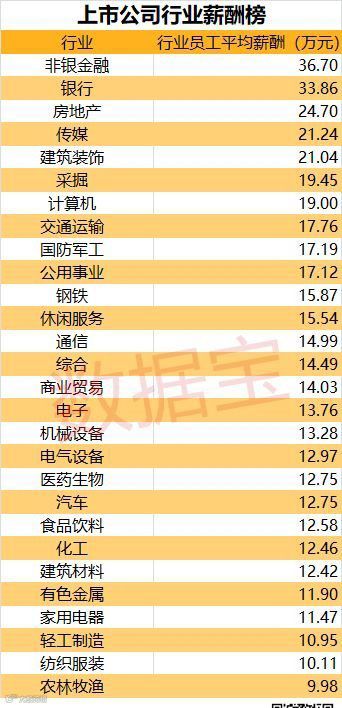数据宝与中国上市公司研究院联合发布2018年A股 "上市公司行业薪酬榜"。排行榜基于2018年上市公司的年报数据,对28个申万一级行业的员工人均薪酬进行排行。