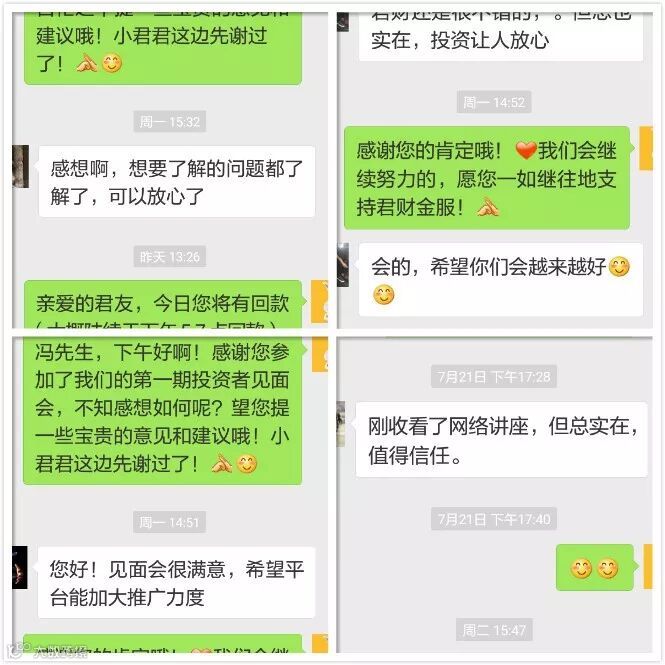 上周六我们组织了首届君友见面会,君财金服创始人但肯先生也针对平台现状及未来发展做了详细的解说,针对君友们的疑问,但肯先生坦诚相告,现场获得众多君友们的一致好评,我们所做的一切都是为了让君友放心,我们不希望看到大家惊慌失措,无助迷茫,见面会后客服小君微信频频收到来自君友们对但总及对君财的肯定!君友们的一句放心,让我们动容,君友们的支持,我们感恩于心!