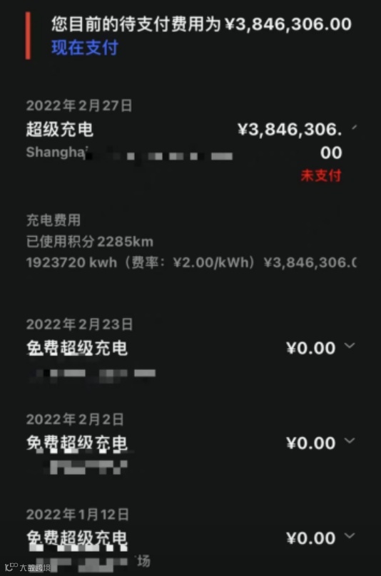 截图显示,其最近一次使用超级充电桩是在今年2月27日,花费为384.63万元,在此之前,均为免费超级充电。对此,特斯拉客服回应称,有部分车辆后台系统出现错误,技术人员正在修复,可能将在24小时内解决问题。