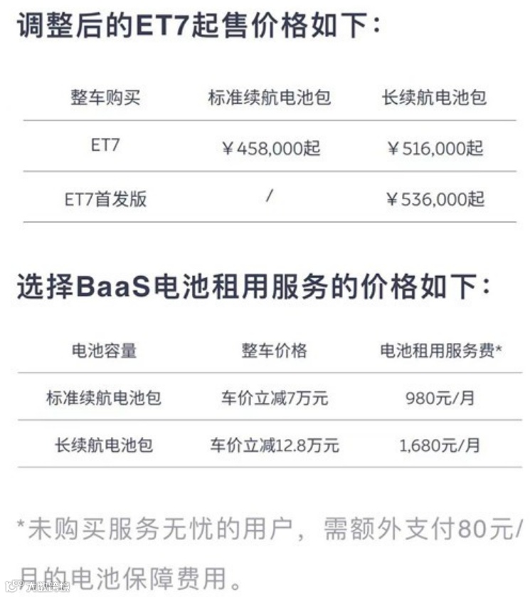 具体来看,ES8、ES6及EC6各版本车型起售价上调1万元,ET7、ET5起售价不变;选择BaaS电池租用服务,长续航电池包(100kWh)租用服务费上涨200元调整为1680元/月;已购车用户不受此次调整影响;电池包按年灵活升级至长续航电池包,价格调整为9800元/年。