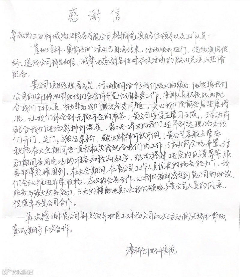 (盖康雨送给梧桐院项目物业人员的感谢信)