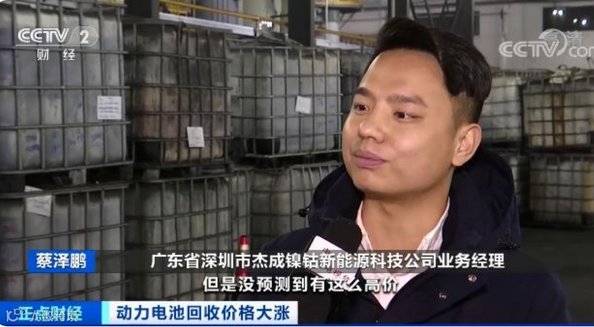 江西省赣州市豪鹏科技有限公司总经理 区汉成:以前一吨的东西现在要翻两三倍、几倍去买,整个资金占用率比较高,这些电池回收企业其实非常担心,当供需关系发生变化,发生逆转的时候,整个市场行情是往下跌的。在往下跌的过程中,也是一天一个价。