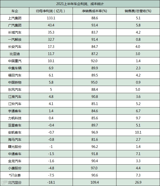数据显示,上汽集团净利润133.1亿,成最赚钱车企,远超第二名广汽集团;团长城汽车、一汽解放净利润分别为35.3亿和32.7亿,分列盈利榜三、四位。