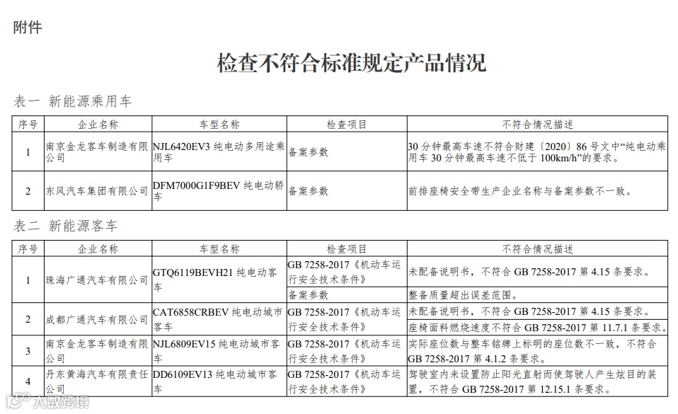 2020年12月8日,工信部发布消息称,为规范新能源汽车生产行为,加强事中事后监管,根据《道路机动车辆生产企业及产品准入管理办法》等有关规定,工信部建立了道路机动车辆产品生产一致性监督检查结果通报制度。在近期工信部组织的对乘用车、客车、专用车等 3 个类别的新能源汽车产品监督检查中,共有 25 家企业的 27 个车型存在生产一致性问题。