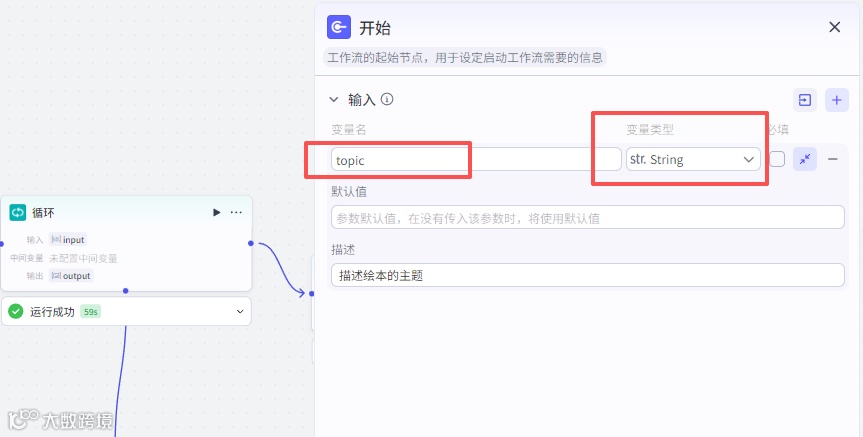 最后我们来调试工作流,点击试运行,topic的值输入绘本的主题,即你想生成什么样的绘本内容,可参考如下。