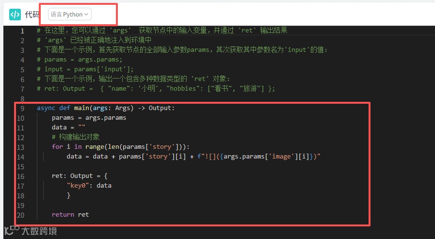 然后我们添加一个代码节点,代码节点有两个输入变量,变量名story,变量值为故事生成节点的story值,变量image,变量值为循环节点的output值。