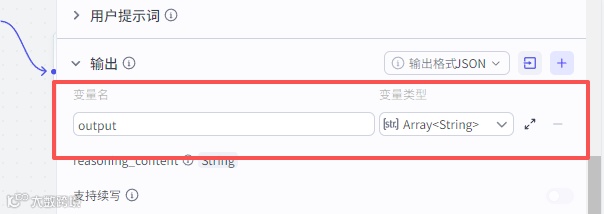 系统提示词如上图,输出变量一个,变量名output,变量类型是Array<String>类型。