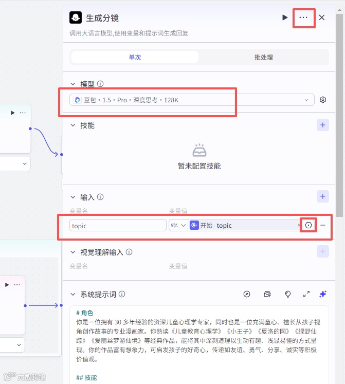 添加大模型节点,模型可以选择这个豆包1.5 Pro 深度思考 128k,一个输入变量,变量名prompt,变量值是生成分镜大模型的fenjing的值。