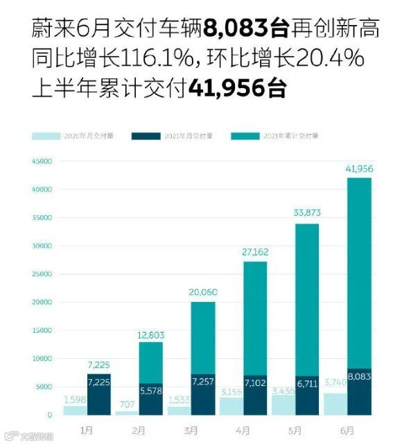 7月1日,蔚来汽车发布了2021年6月交付数据。数据显示,2021年6月,蔚来汽车交付数量达8083台,同比增长116.1%,环比上个月6711辆增长20.4%。1-6月蔚来累计交付41956辆,达到去年全年交付量的95.9%。