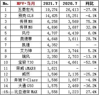 榜单前三名变化依旧稳定,五菱宏光蝉联MPV销冠,月销19,274辆与上月基本持平,同比下降27.0%;第二名依旧是别克GL8,7月销售14,625辆,同比小幅度下滑4.1%。传祺M8在2021年7月份的销量达到了6258台,同比上涨75.3%,但销量与第二名存在较大差距。