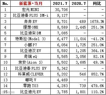 自主品牌中,宏光MINI7月售出30,706辆,排名上升至第二位;帝豪再次进入榜单排名第十,7月份售出1.41万辆,同比下滑20.2%;长安逸动较上月排名有所提高,本月排名第12位,销量为12762辆。