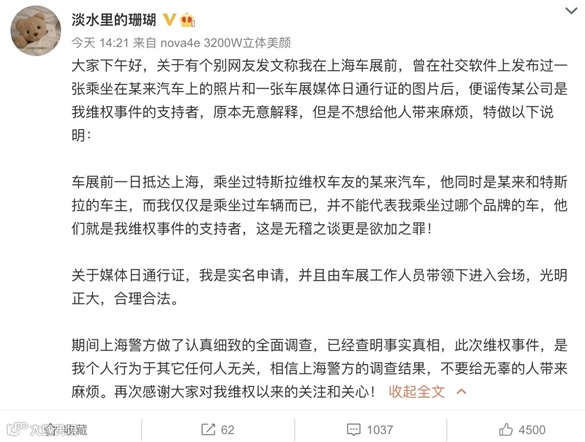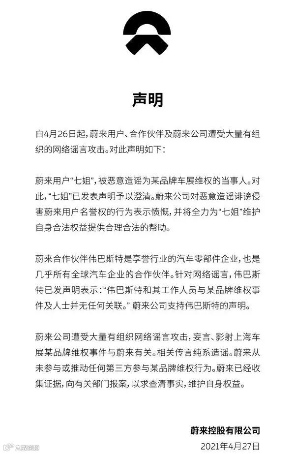 此外,另有传言称,特斯拉维权女车主是4年前因断轴维权的Model X车主,也是上海车展蔚来汽车展台的车主志愿者“七姐”,蔚来在声明中也对此事进行澄清,表示将全力维护“七姐”的合法权益。