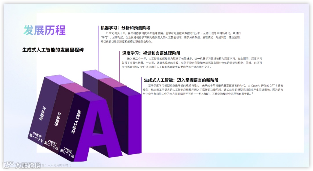 2010年后,深度学习时代到来,AI发展已经取得了长足进步,从深度神经网络(提取、预测复杂的特征和模式)到自然语言处理(计算机程序能够理解人类语言,根据语言指令生成结果),GPU加速计算更成为了深度学习大模型的发展基石。
