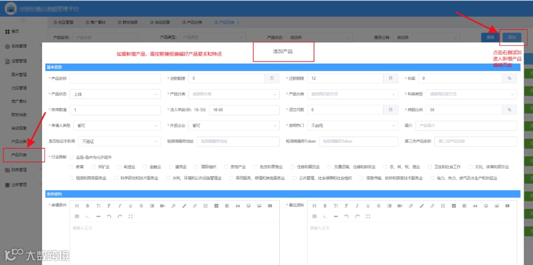 产品列表:如需上线其他产品,点击右侧“添加”, 按照模板编辑相应的内容,选择好对应的产品分类、准入要求、所需资料、开放区域、产品海报以及 logo,流程指引,进件链接等等,上架以后会在手机端显示。