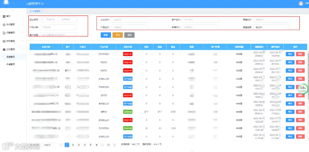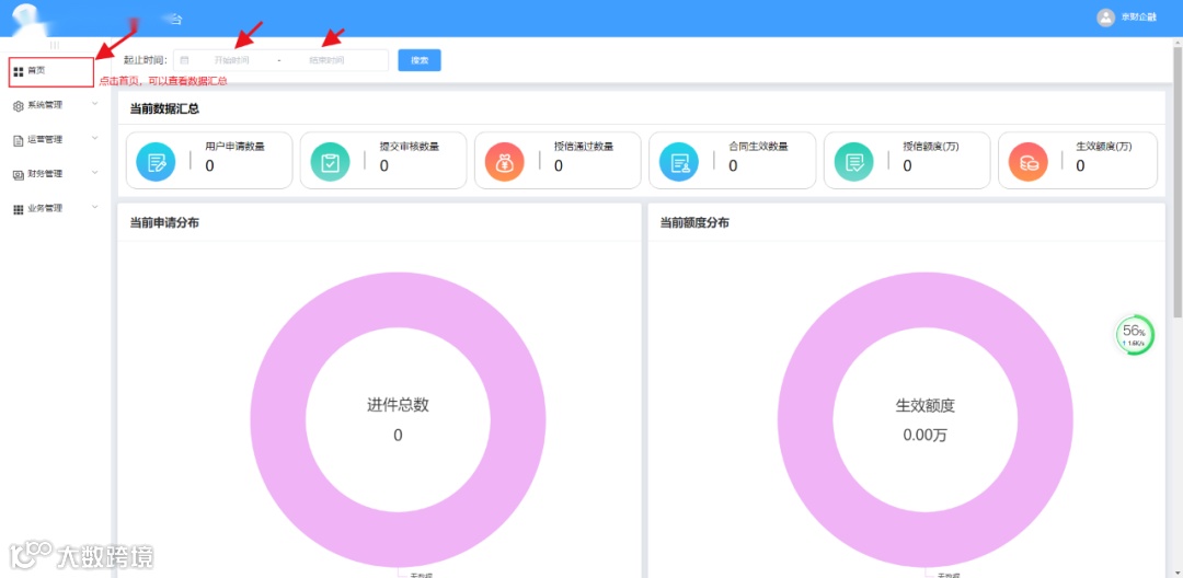 根据起止时间,筛选查看时间,搜索想要查看的“数据汇总”,若不选择时间,默认显示当天数据汇总情况,包括:用户申请数量、提交审核数量、授信通过、合同生效数量、授信金额以及生效金额。