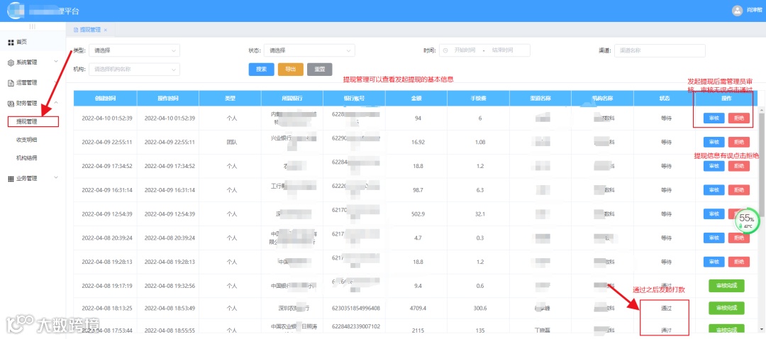 1.2 机构管理员,需点击“操作”- “审核” ,核实提现信息无误之后,点击“审核通过”,下一步给渠道卡号转账即可;如果提现信息有误,可点击“拒绝”联系渠道修改后重新发起 提现。
