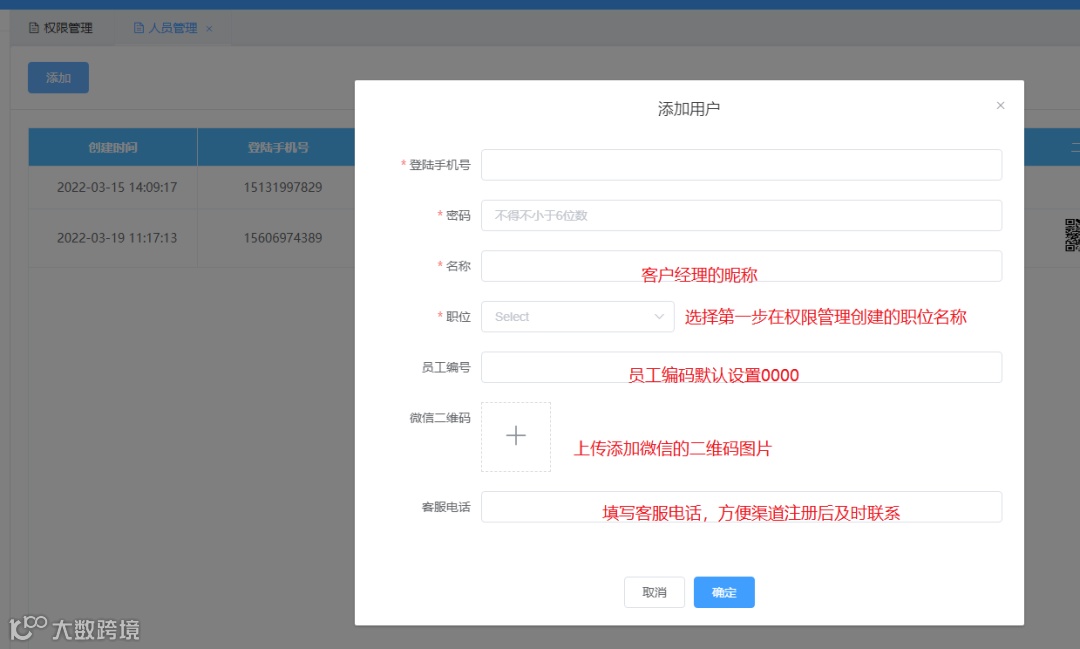 人员管理:添加完权限以后,点击人员管理-添加-添加用户页面。