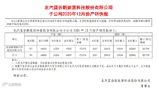 销量下滑在财报中的体现淋漓尽致,1月份北汽蓝谷的业绩预告中称,2020年公司归母净利润及扣非后的归母净利润将会有超过60亿元的亏损,这个亏损数额超过公司上市依赖的盈利总和。