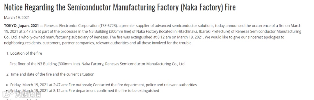 瑞萨表示,昨日火势已在当地时间早上8点左右扑灭,对于本次起火原因以及制造设备和财务方面的损失正在进行彻底调查,并努力防止类似事件再次发生。