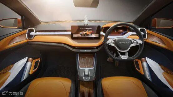 内饰方面,斯柯达Vision IN概念车的设计也很时尚,方向盘为三幅式,中间部分配有镀铬装饰,采用了12.3英寸的悬浮式中控大屏和液晶仪表盘。车内座椅采用的是黄色的一体化桶式座椅,后排座椅中间的扶手可以伸缩,既显档次,又很实用。后备箱空间比较规整,底部配有两条黄色固定带。