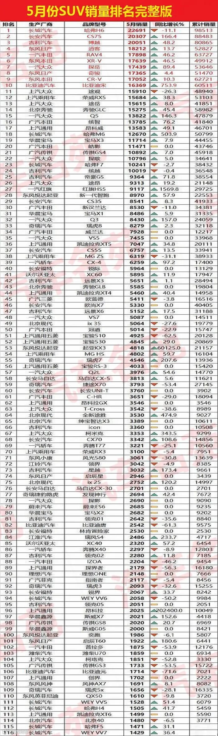 2、其次是排名21-116位的SUV车型,广汽传祺GS4排名第21位,单月再破万辆大关,同比增长7%,大众探歌、哈弗F7和吉利缤越的5月份销量也都突破了万辆大关。而大众途昂、红旗HS5、起亚智跑、丰田汉兰达、奇瑞瑞虎8和丰田威兰达等车型的表现,也是非常不错的。另外,名爵ZS表现不佳,同比下滑31.1%,现代ix35、本田冠道和宝骏510的表现也不是很好,月销量都在5000左右。