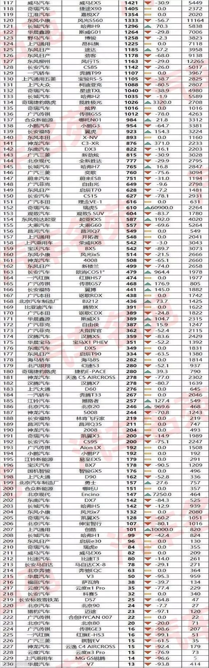 3、最后是排名117-230位的SUV车型,其中哈弗H9、日产途达、揽胜极光、福特翼虎和起亚KX5等车型,都实现了同比大增,而日产劲客、长安CS85、奇瑞星途TXL、传祺GS5、小鹏G3和三菱新劲炫等车型,则是出现了大幅下滑。另外,哈弗H1、比速T3、长安科赛5、传祺GE3和华晨V7等车型,5月份销量都是不足100。