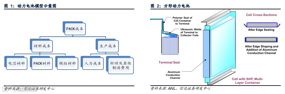 锂电池根据应用领域的不同分为动力电池、储能电池和消费电子电池,不同类型锂电池的成本构成自然不同,本篇报告主要 讲述应用最广泛的动力电池成本结构。动力电池在不同的正负极材料下其成本有一定差别,整体来看材料成本占比较大,人 工成本、折旧及其他制造费用占比较小,而材料成本则主要以正负极材料、隔膜、电解液和组件为主。 我们在动力电池成本模型里将 PACK 成本拆分成材料成本和生产成本,其中材料成本又包括电芯材料、模组材料及 PACK 材 料,生产成本包括人力成本、折旧及其他制造费用。我们参考 ANL 的成本测算模型,选取方形电池进行成本拆分。
