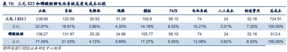 在考虑模组、PACK 及电池系统的情况下,三元 523 和磷酸铁锂电池系统的总度电成本分别为 724.91 和 612.40 元/kWh。