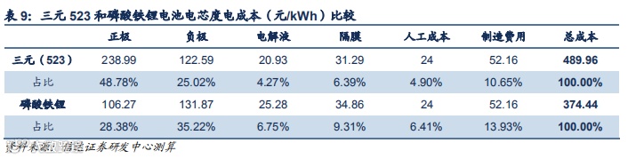 总结 仅考虑电芯的情况下,三元 523 和磷酸铁锂电芯的度电成本分别为 486.96 和 374.44 元/kWh。