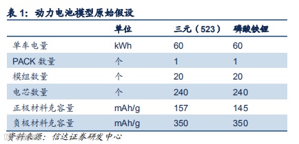 我们假设单车带电量 60kWh,包括 1 个电池包,20 个模组和 240 个电芯,以上假设主要用于测算模组和 PACK 组件成本。 我们选取三元动力锂电池 523 型和磷酸铁锂电池作为研究对象进行分析比较。参考当升科技公告数据,我们假设三元(523) 正极材料实际克容量为 157mAh/g。参考国轩高科和丰元股份公告数据,目前国内磷酸铁锂正极材料实际克容量基本已经达到 150mAh/g,我们取 145mAh/g 的平均水平作为磷酸铁锂正极材料实际克容量假设。参考杉杉股份公告数据,我们假设负极活 性材料(人造石墨)实际克容量为 350 mAh/g。