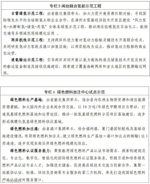 加快推进福州、厦门国家燃料电池汽车示范城市建设,参照国家燃料电池汽车示范城市政策,研究制定地方配套支持政策;推广50个氢能产业应用示范场景;支持省能化集团有效整合资源要素,开展清洁能源制绿氢制绿色氢基燃料示范,实施“绿电制氢+余电上网”,通过稳定的绿氢供应带动下游产业应用;打造绿氢产业园区,实施清洁低碳氢替代应用;推进嘉庚创新实验室全国首个海岛绿氢综合能源应用示范项目;支持钢铁企业牵头开展氢能冶金技术研发,推进钢铁行业绿色转型;鼓励开展可再生能源制氢示范,探索布局氢基绿色船舶燃料合成与加注试点项目,推动船舶行业节能降碳转型。
