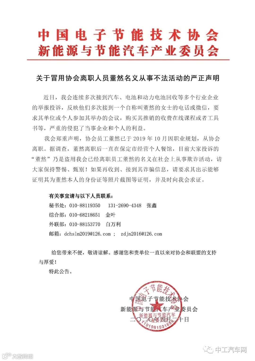 近日,我会连续多次接到汽车、电池和动力电池回收等多个行业企业的举报投诉,反映他们多次接到一个自称叫董然的女士的电话或微信,要求其单位或个人参加其举办的会议,购买其推销的收费在线课程或者工具书等,严重的侵犯了当事企业和个人的利益。