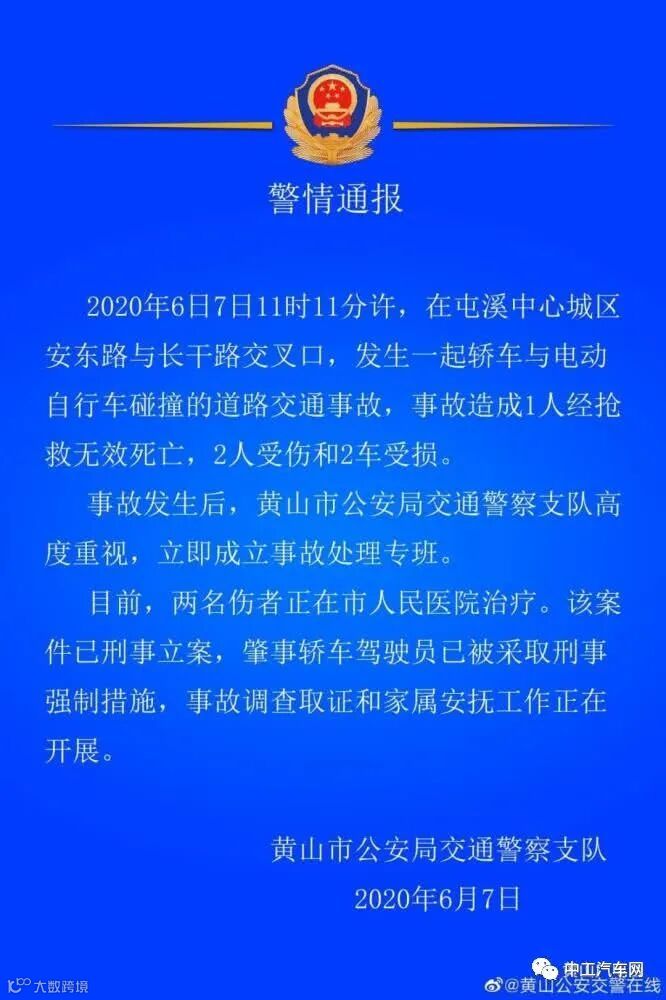 6月7日,安徽黄山发生一起轿车与电动车碰撞事故,致1人死亡,2人受伤。目击者称,电动车上乘坐的是2名老人和1名女童,“电动车可能被拖行了30几米,司机下车抱了条狗,救助伤者都是其他市民进行的”。