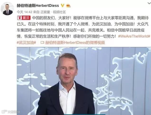 2月17日,大众汽车集团管理董事会主席赫伯特迪斯(HerbertDiess)开通个人微博,其希望通过此举与中国消费者零距离沟通,并借此为武汉加油。