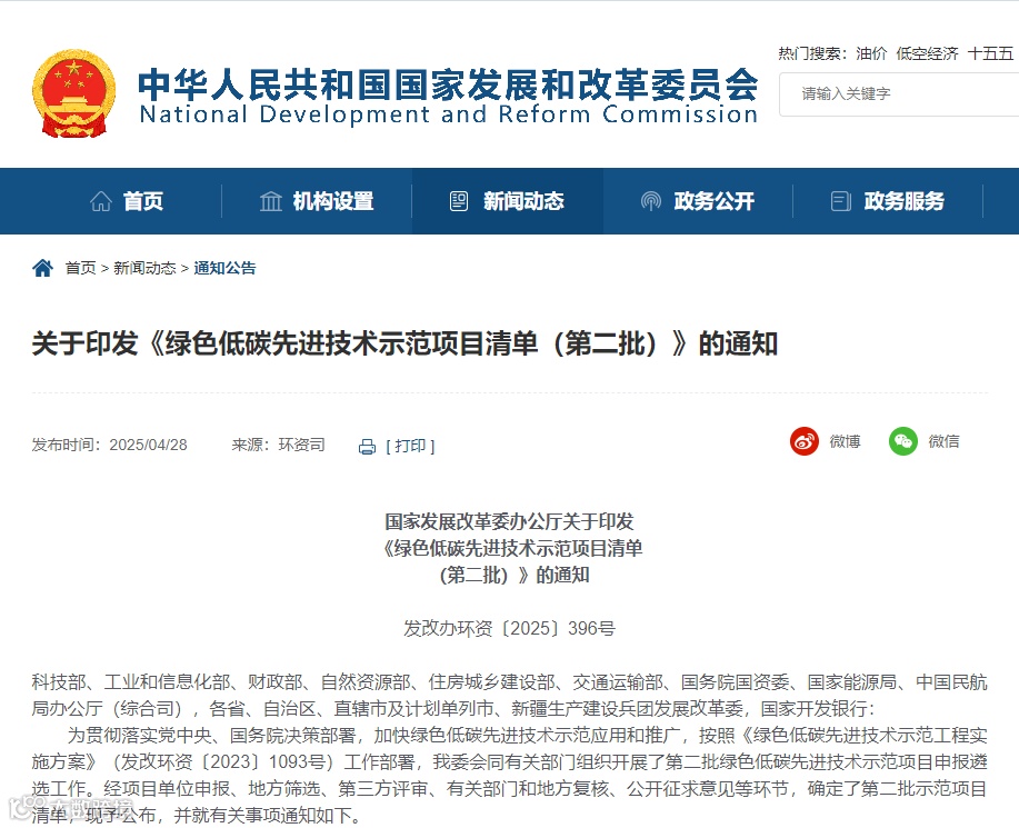 4月28日,国家发改委发布关于印发 《绿色低碳先进技术示范项目清单 (第二批)》的通知。
