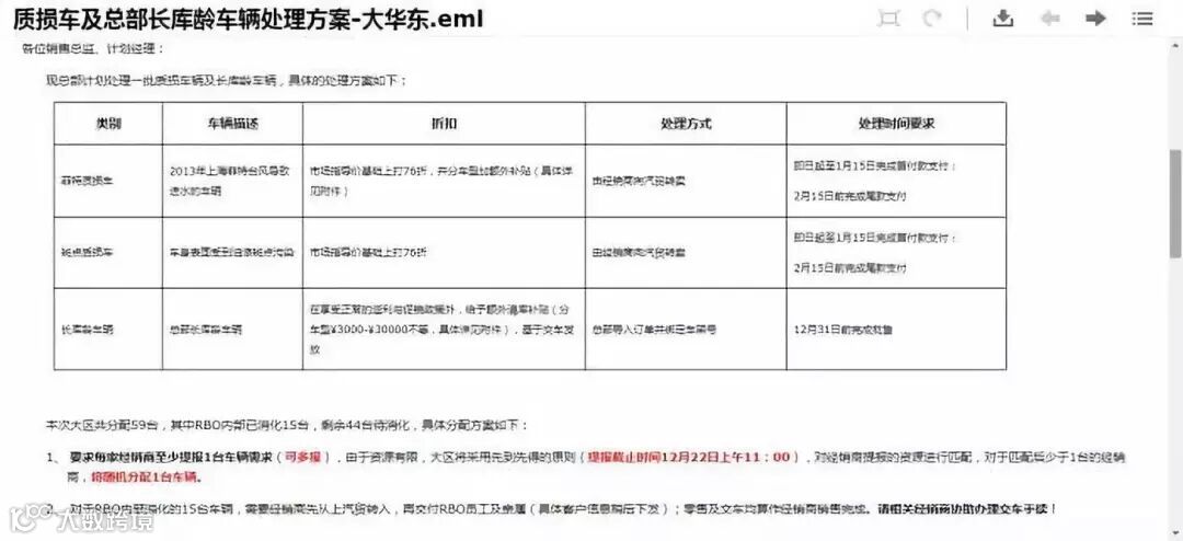 该邮件内容提到,此次大华东区共分配到59台上述车辆,其中内部已消化15台,剩余44台待消化,要求每家经销商至少提报1台车辆需求。该份邮件的两个附件,分别是汽贸转卖流程和车况信息EXCEL表。