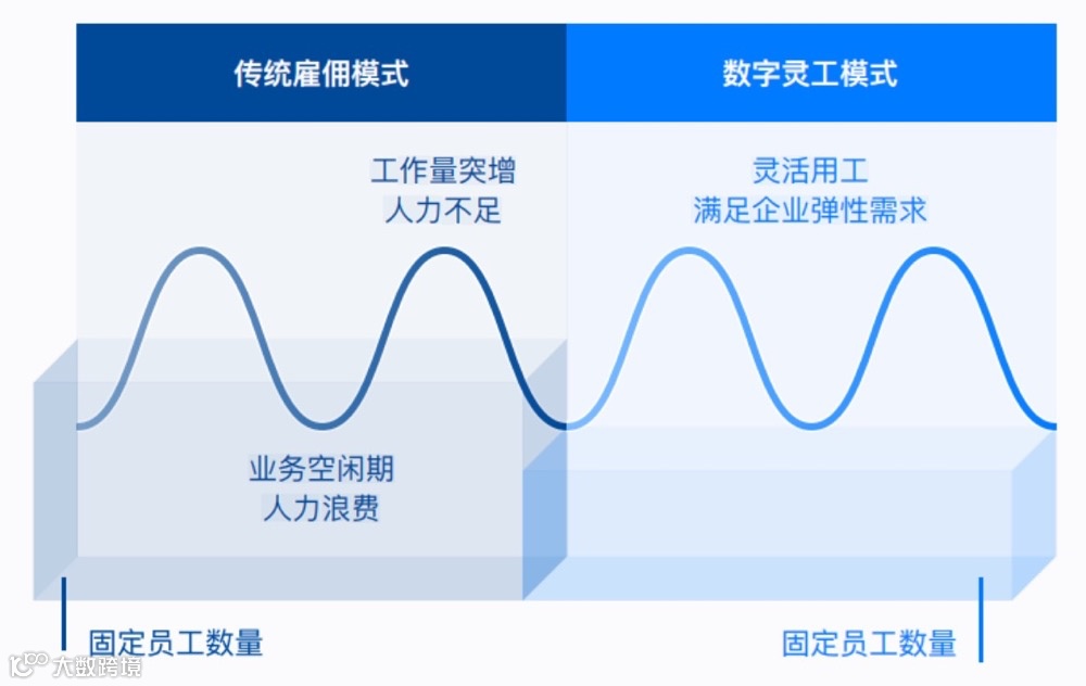 数字灵工模式通常是企业通过平台“按需”匹配人手,具有更强的灵活性,可以满足企业的弹性需求,这样可以有效解决在波动的业务量下人力资源浪费或人手不够的问题,还能降低永久雇佣带来的冗余成本。在波动的工作量下,企业用工差别: